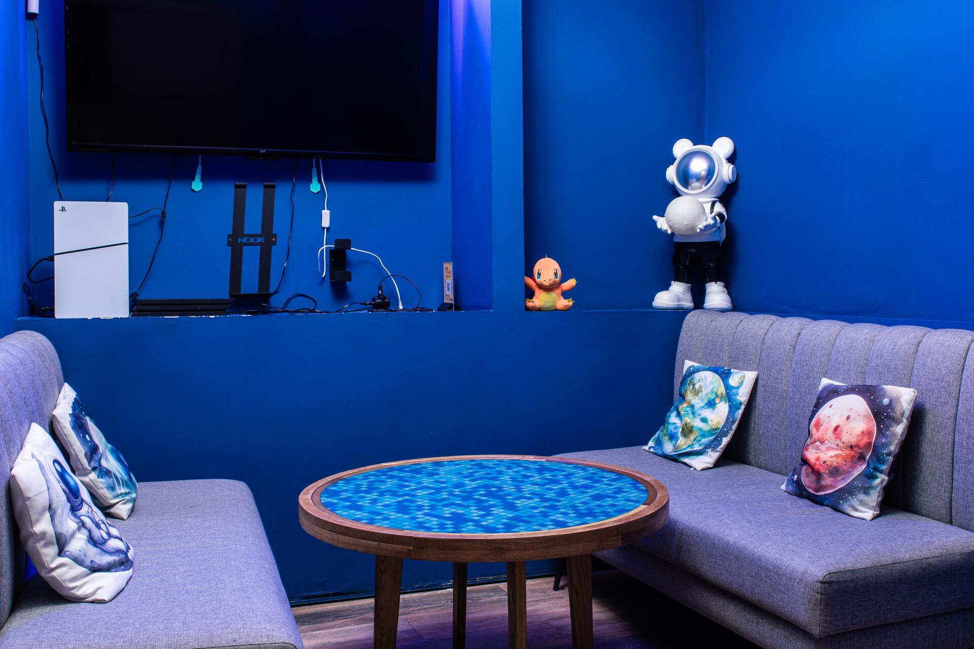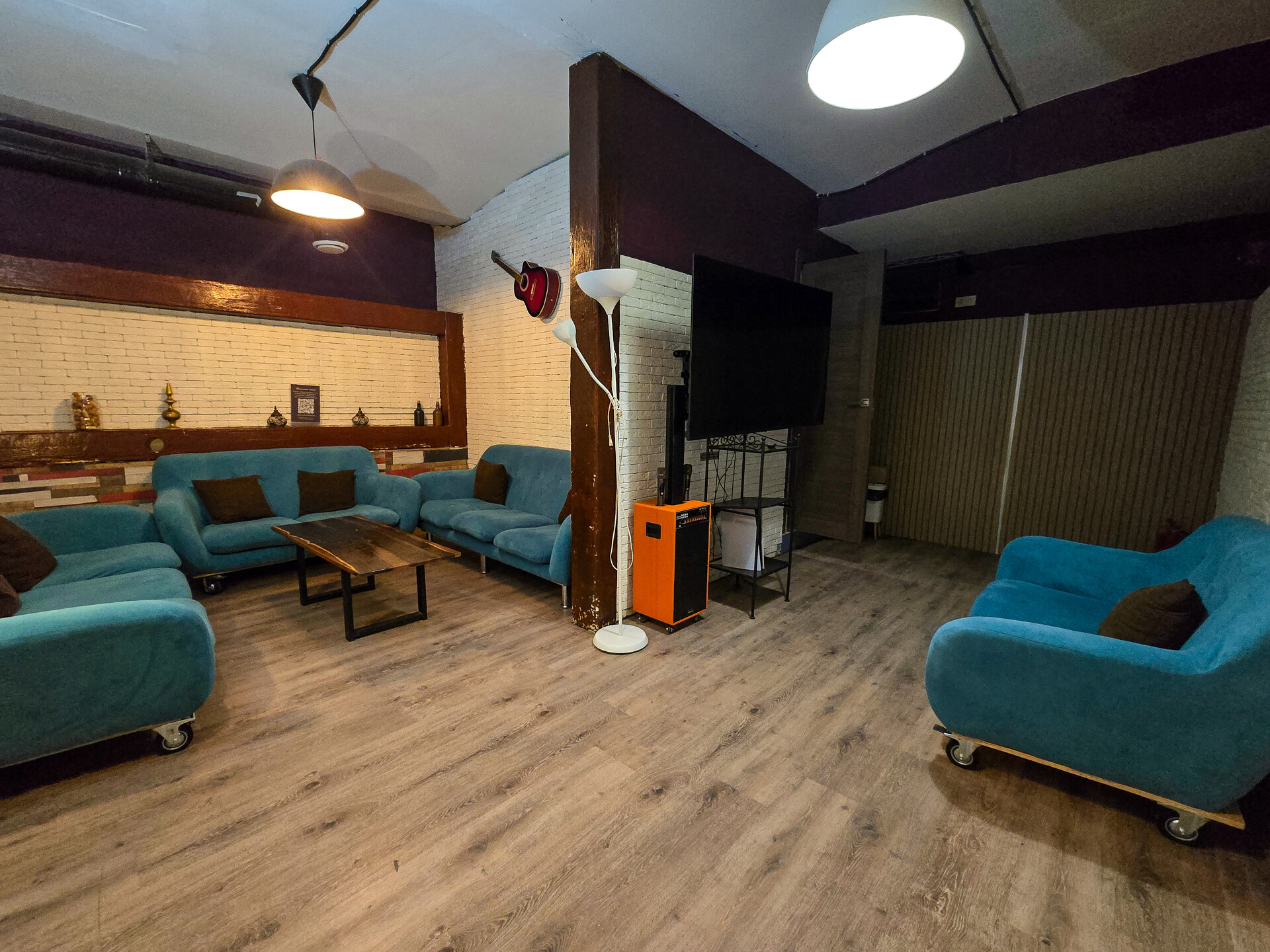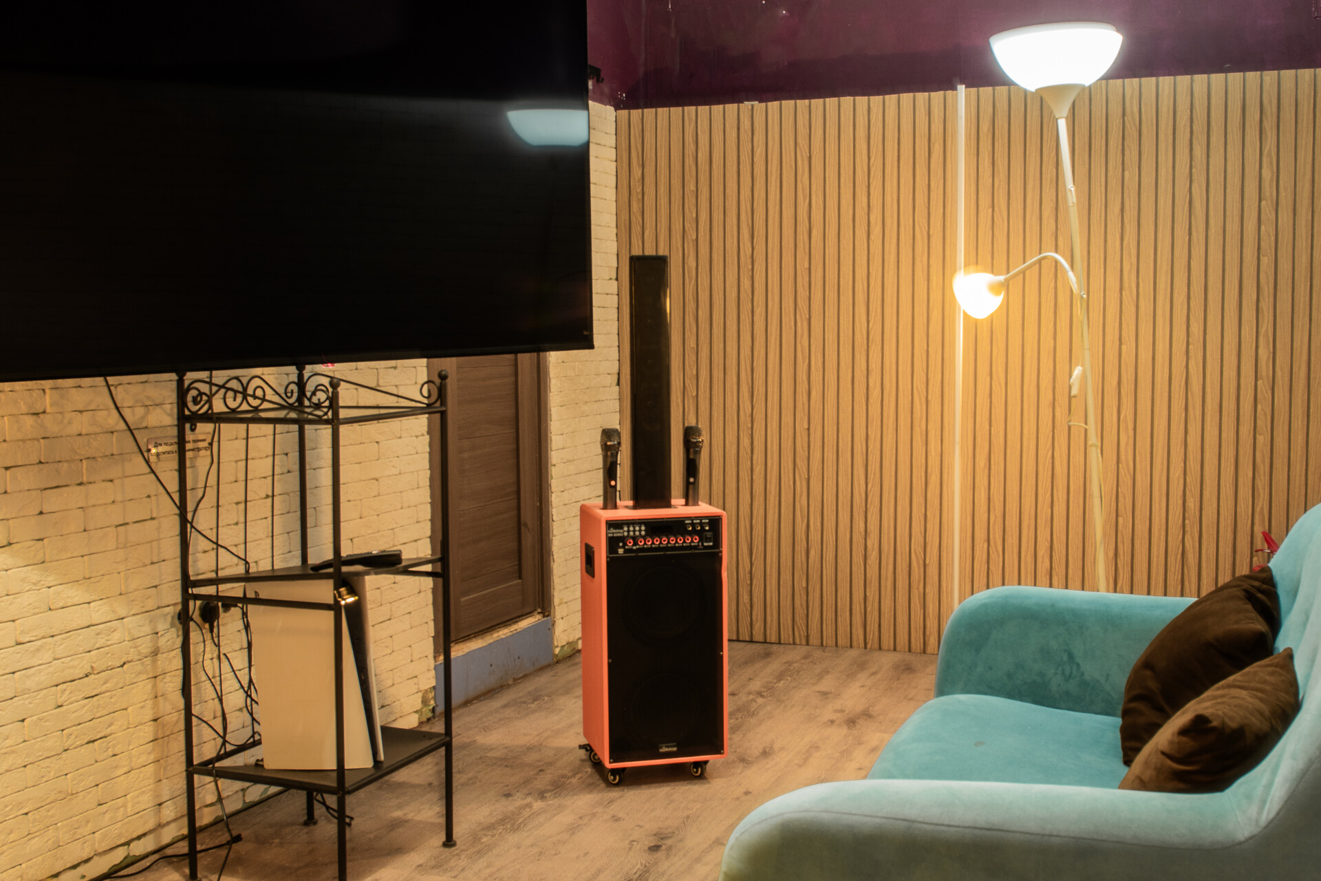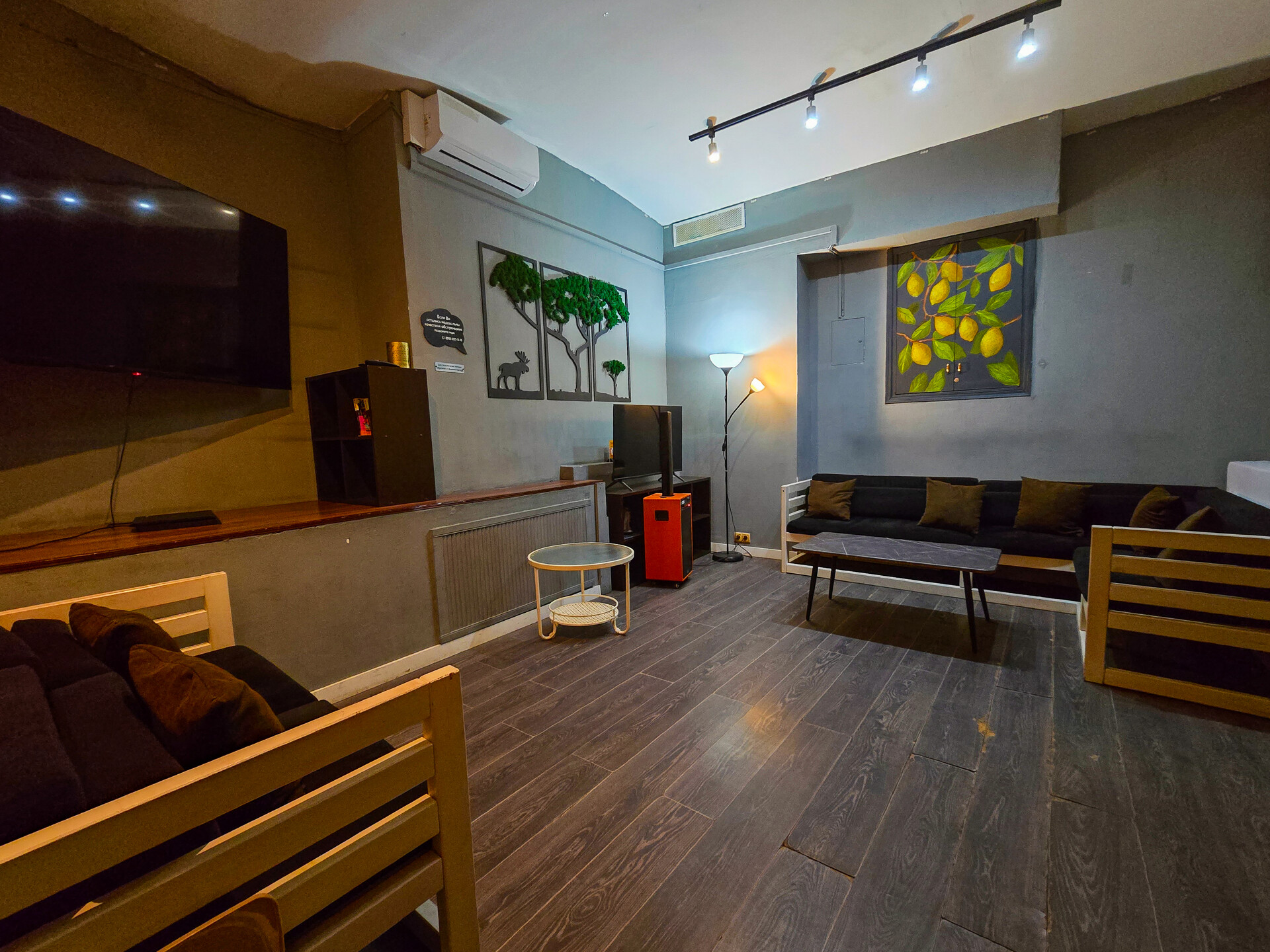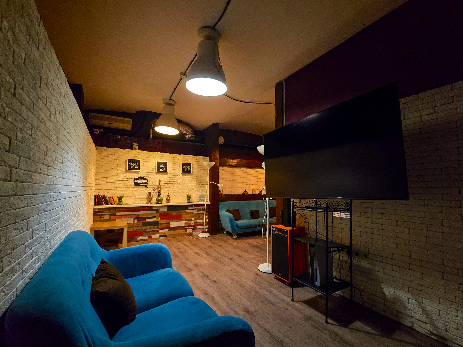 Зал оборудован Xbox One с Kinect, PS4, плазмой 210 см с разрешением 1080 Full HD, танцевальным симулятором Just Dance, караоке-системой и музыкальным центром.