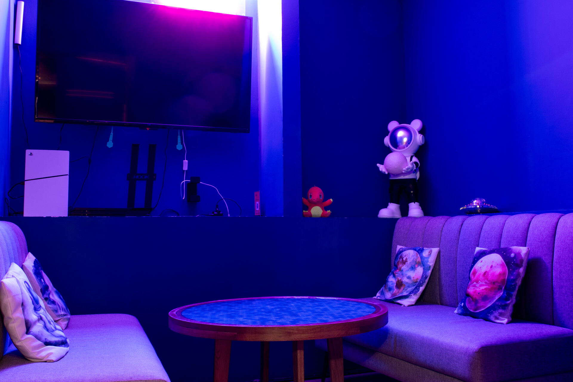 Оснащен проектором, колонками, удобными диванами, Xbox One c Kinect и танцевальной установкой,а также светодиодной подсветкой.