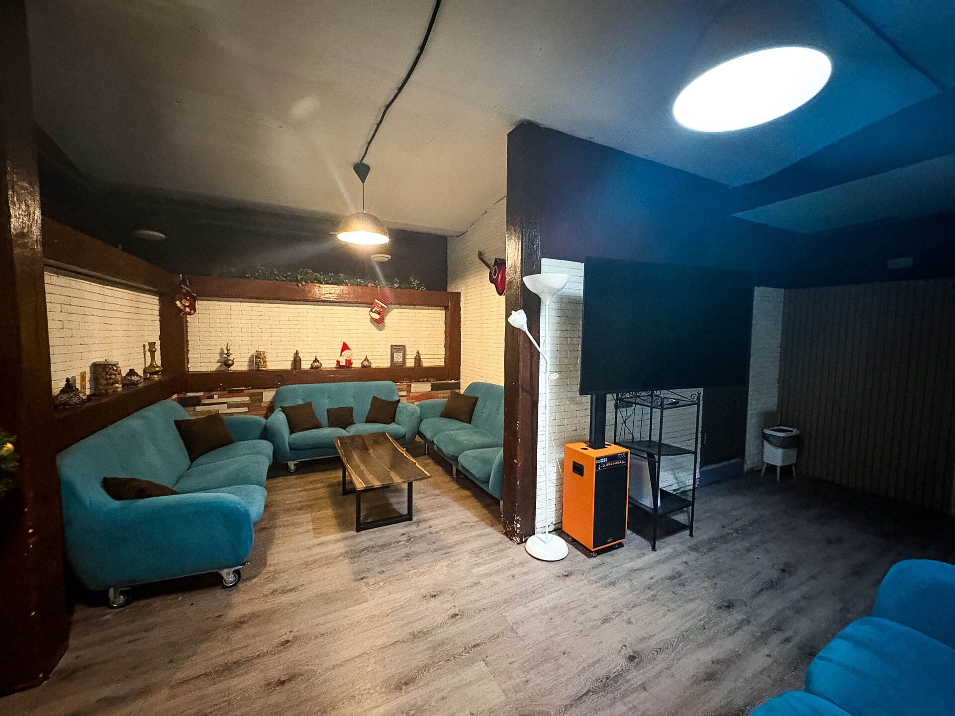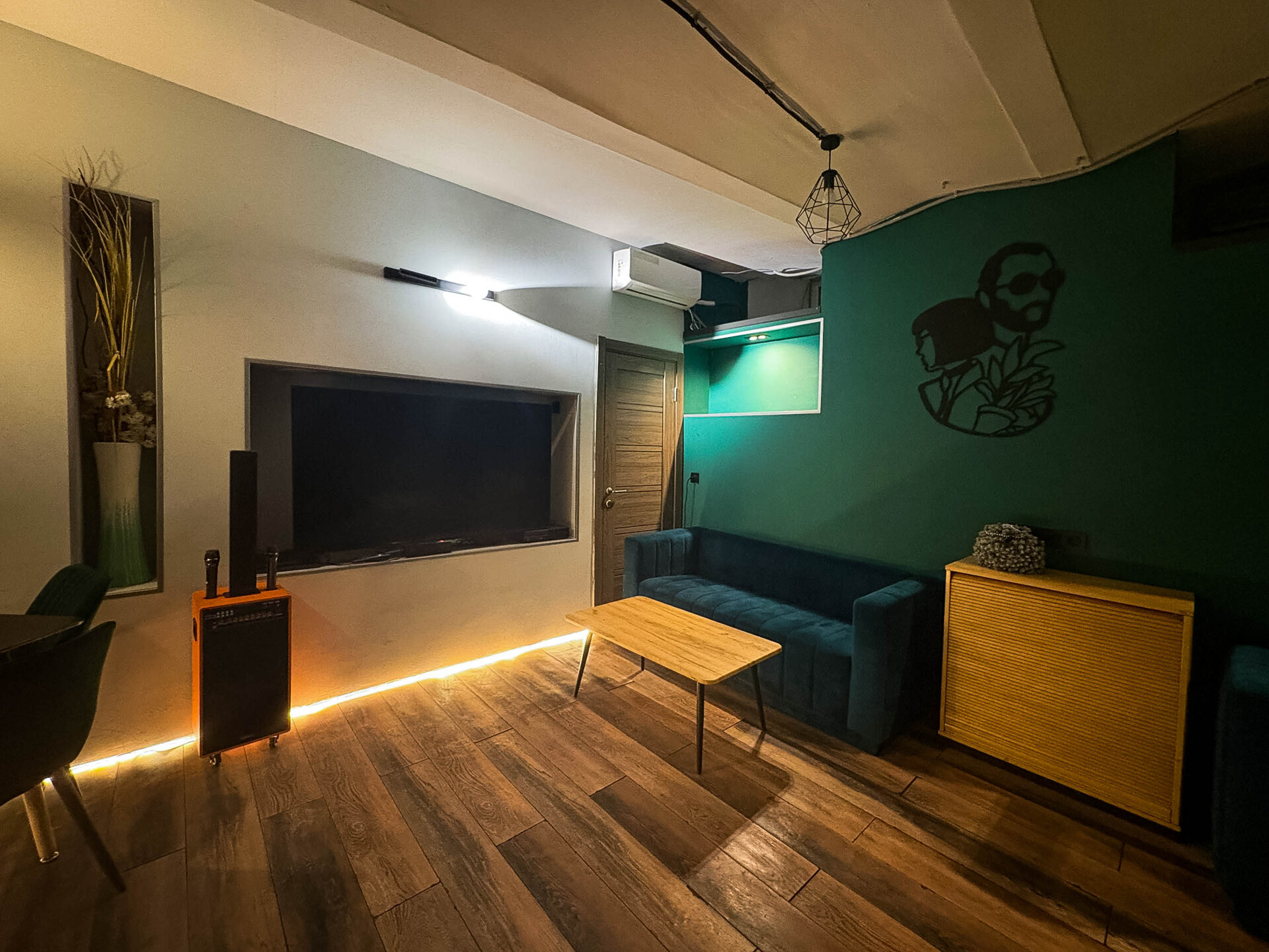 Зал оборудован Xbox One с Kinect, PS4, плазмой 210 см с разрешением 1080 Full HD, танцевальным симулятором Just Dance, караоке-системой и музыкальным центром.